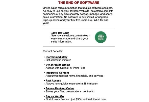 Here’s a screenshot from Salesforce in 2000 when they started in earnest. Yes, every company starts this ugly!