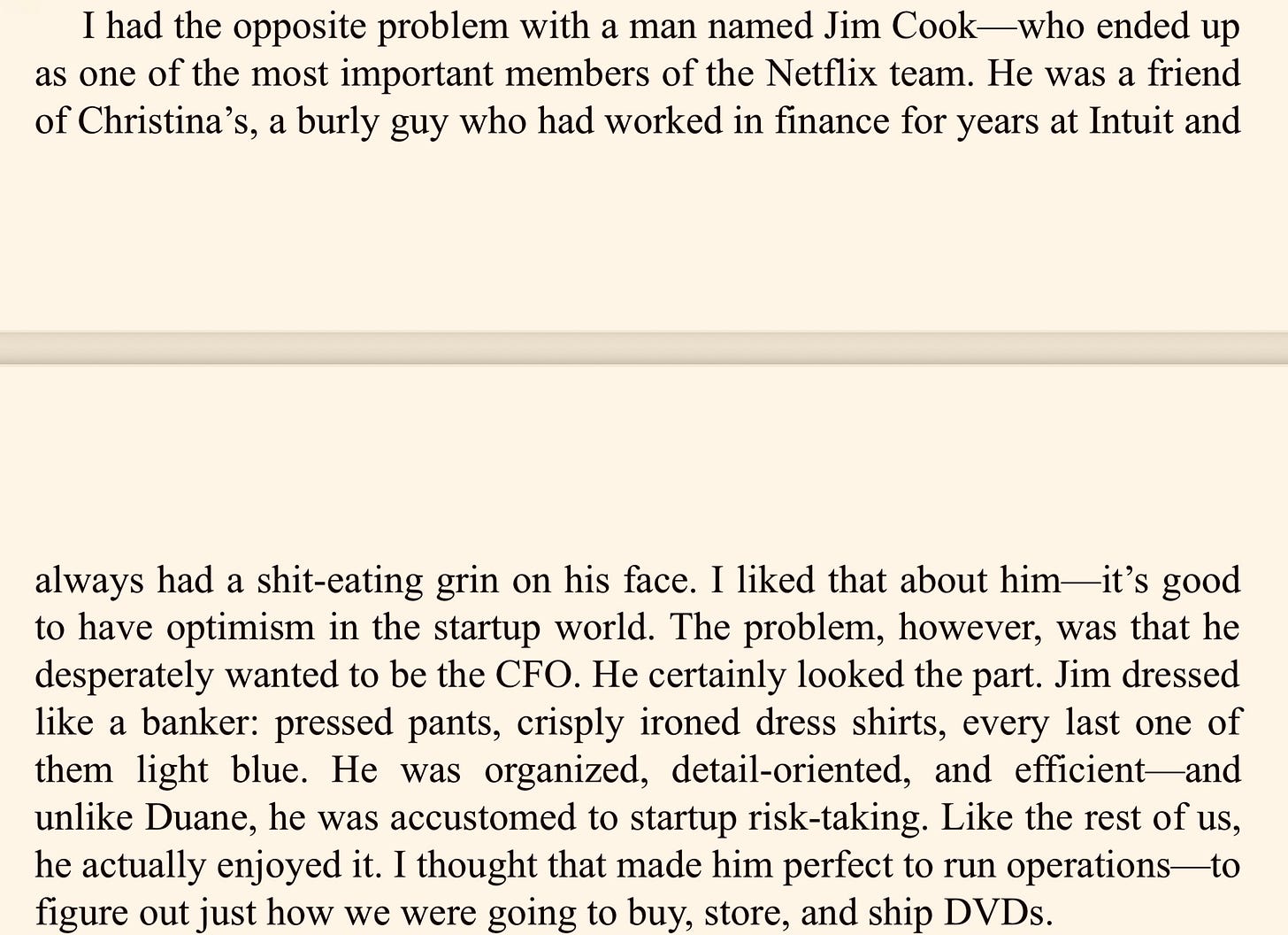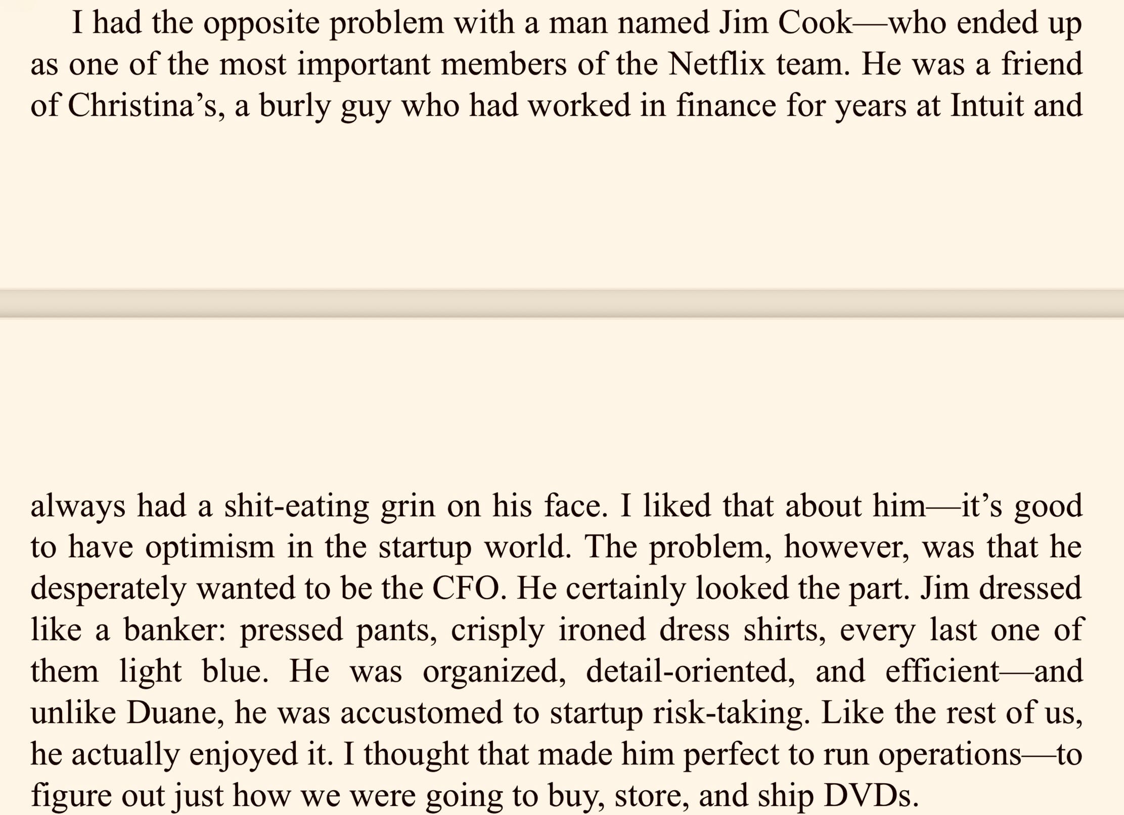 I had the opposite problem with a man named Jim Cook — who ended up as one of the most important members of the Netflix team.