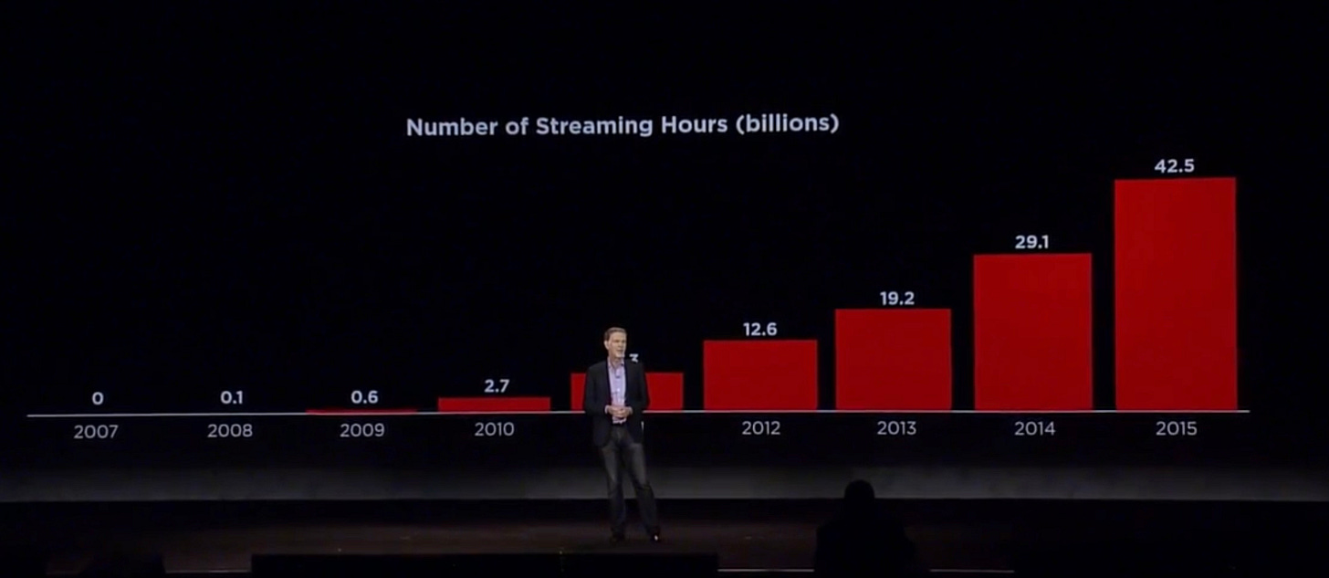 Reed goes on to say above in Jan 2016 that Netflix had almost achieved reaching 50% of all US Households at the time… which means there was 50% more to reach! Worldwide in 2016, Netflix had reached 70 million homes. Today (2025) Netflix is in 300 million homes worldwide and is still only 80% of all US homes.