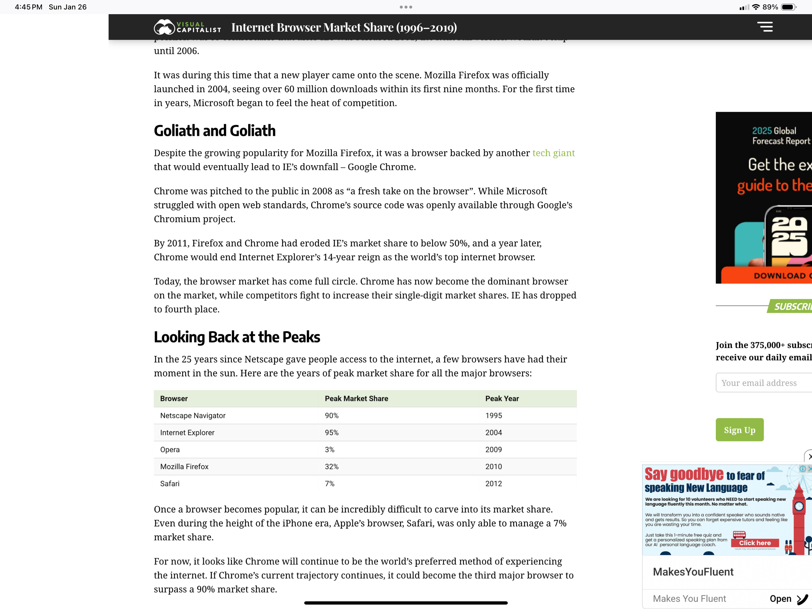 The small, nimble, and passionate Mozilla-Firefox team changed all that in a flash in November of 2004. They launched a faster, more secure, and easier user interface (including tabbed browsing) and took out an ad in the NY Times. Mozilla-Firefox exploded onto the scene, and over the next 4 years, hit a peak of 30% browser market share and brought back to life a software category left for dead.