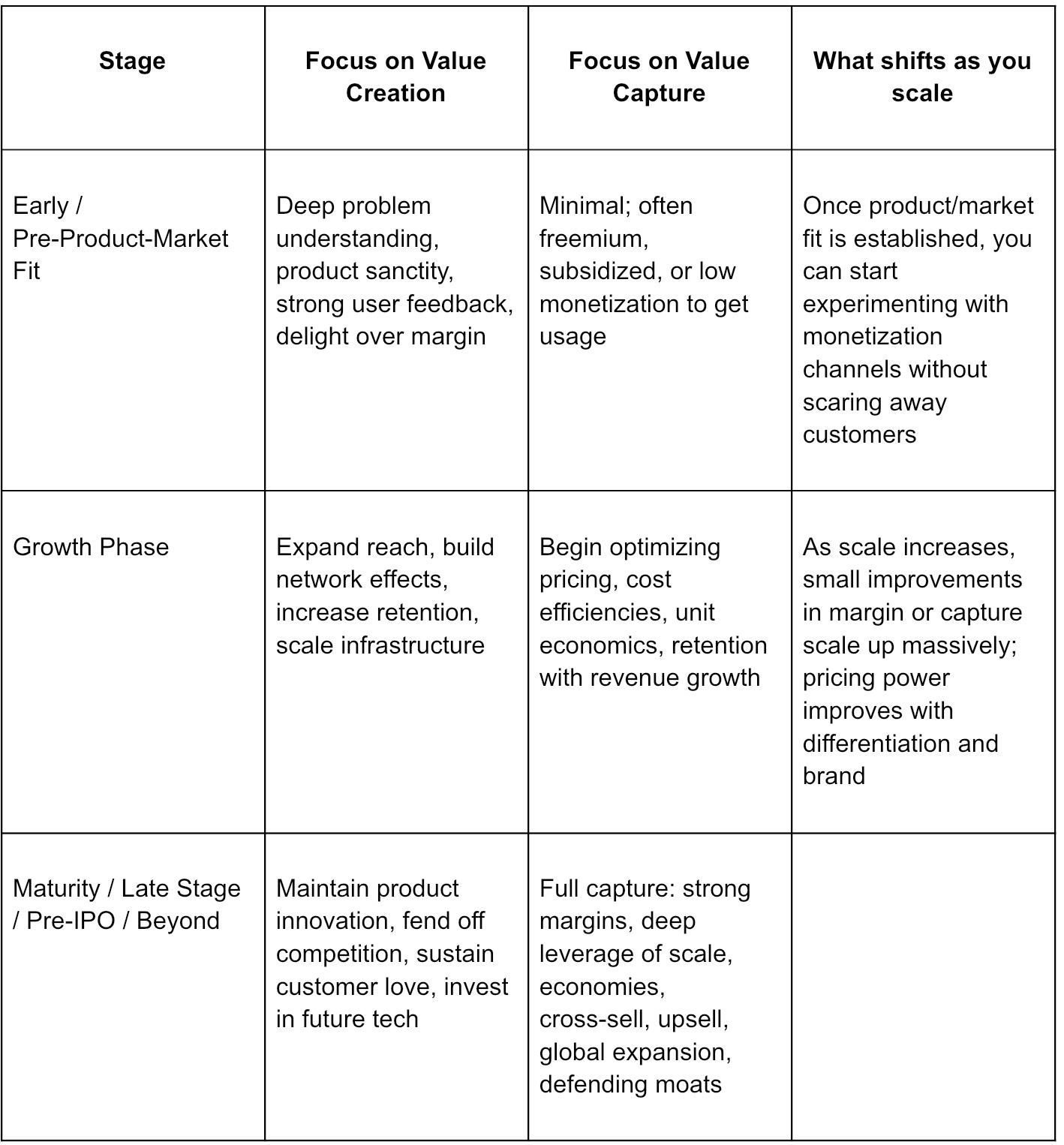 Here are typical trade-offs and how a company should evolve its balance of value creation vs value capture: