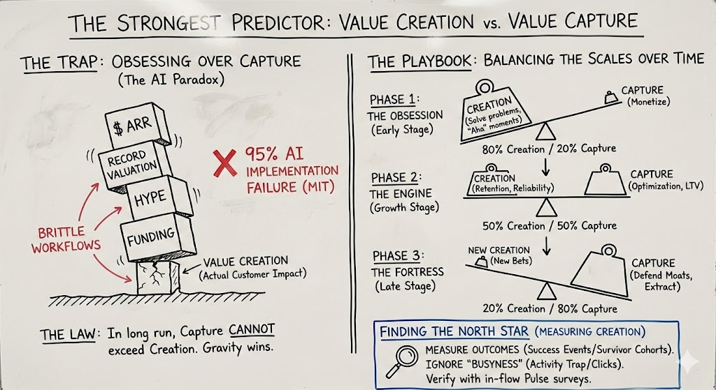 Most companies have this backwards. They obsess over value capture while hoping value creation happens automatically. They optimize pricing and packaging while the actual foundation erodes beneath them.